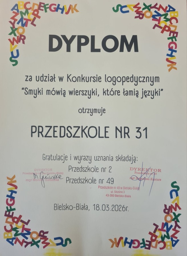 Agatka z grupy Muchomorkow oraz Aleksander z grupy Smerfów reprezentowali nasze Przedszkole w Konkursie Logopedycznym "Smyki mówią wierszyki, które łamią języki" zorganizowanym przez Przedszkole nr 2 i Przedszkole nr 49.