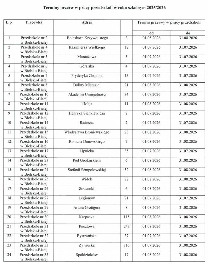 Poniżej skan Zarządzenia Nr ON-II.0050.835.2025.ES Prezydenta Miasta Bielska-Białej z dnia 17 grudnia 2025 r. w sprawie ustalenia terminów przerw w pracy przedszkoli prowadzonych przez Gminę Bielsko-Biała na rok szkolny 2025/2026.