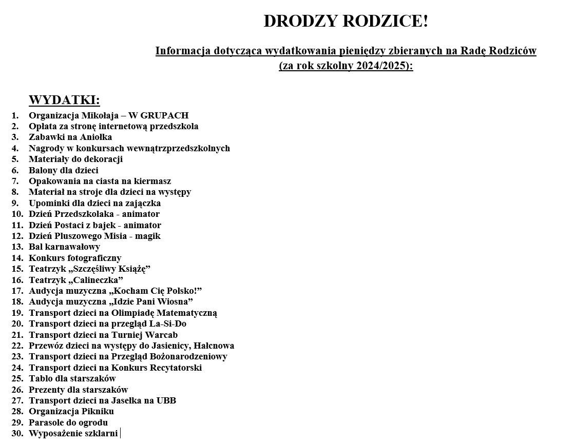 Poniżej informacja dotycząca wydatków z Funduszu Rady Rodziców za rok szkolny 2024/2025
