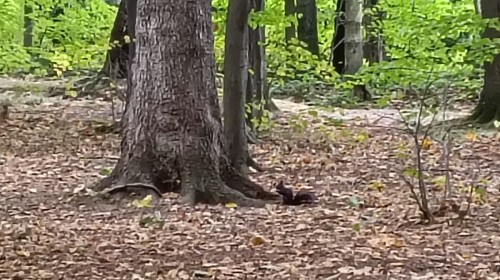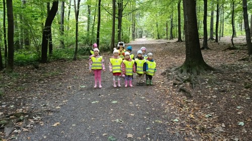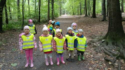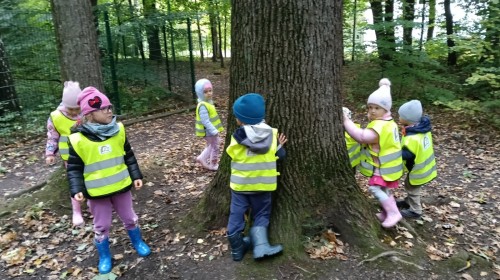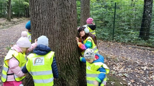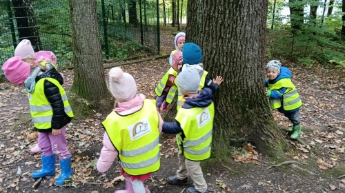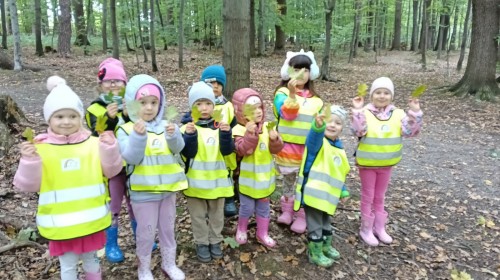 Tydzień o jesieni w lesie rozpoczęliśmy od spaceru do pobliskiego lasu. Przedszkolaki oglądały drzewa w ich naturalnym środowisku. Poznawały wielozmysłowo: zapach lasu, fakturę kory drzew: dąb i brzoza, doświadczały szeleszczących pod stopami liści. Obserwowały rożne drzewa i ich nasiona: dąb, klon, kasztanowiec. Przytulały się do wielkiego dębu. Wielką atrakcją okazało się podglądanie wiewiórki. Duszki zabrały z lasu pamiątki – jesienne liście. Bardzo się im podobało w lesie.