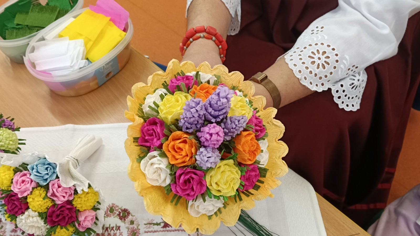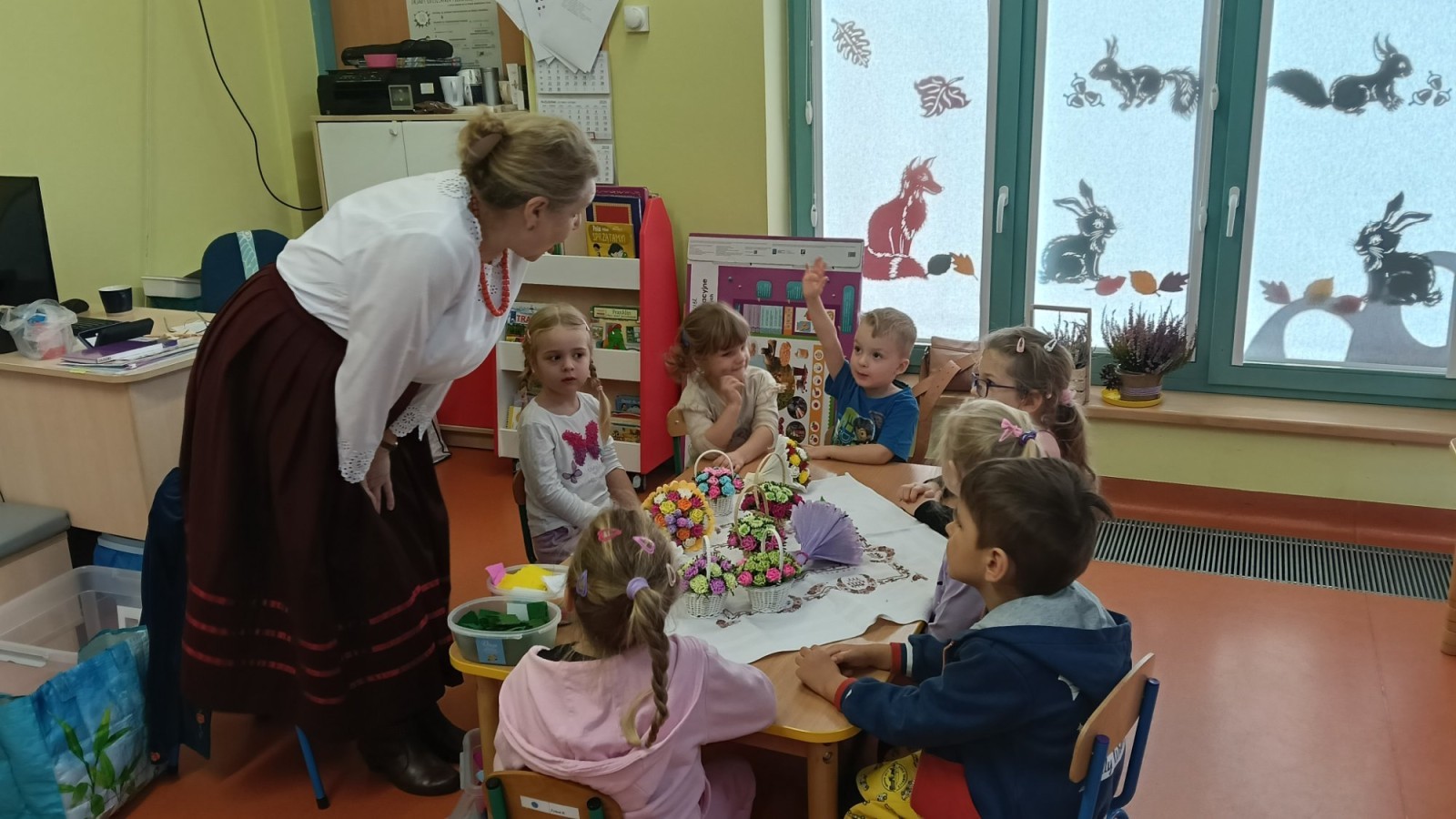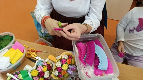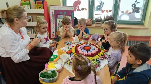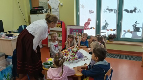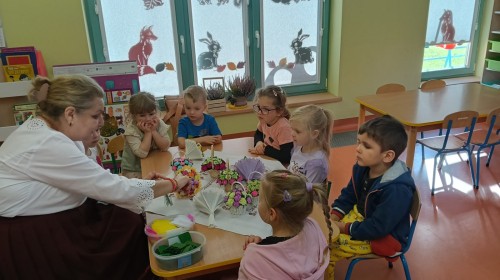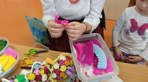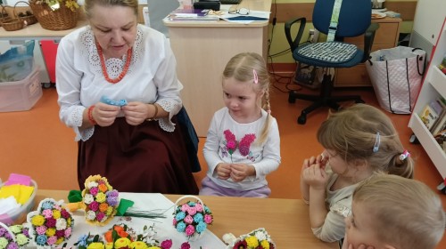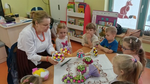 Ciekawą osobą, która spotkała się z dziećmi była Pani Grażyna Patera, która zaprezentowała bibułkarstwo, zapomnianą, a niezwykle urokliwą sztukę ludową polegającą na wykonywaniu papierowych kwiatów. Twórczyni ludowa pokazała dzieciom jakie cuda można wyczarować z kolorowej bibuły. Każde dziecko otrzymało na pamiątkę bibułkowy kwiatuszek. To był cudowny powrót do naszych korzeni.