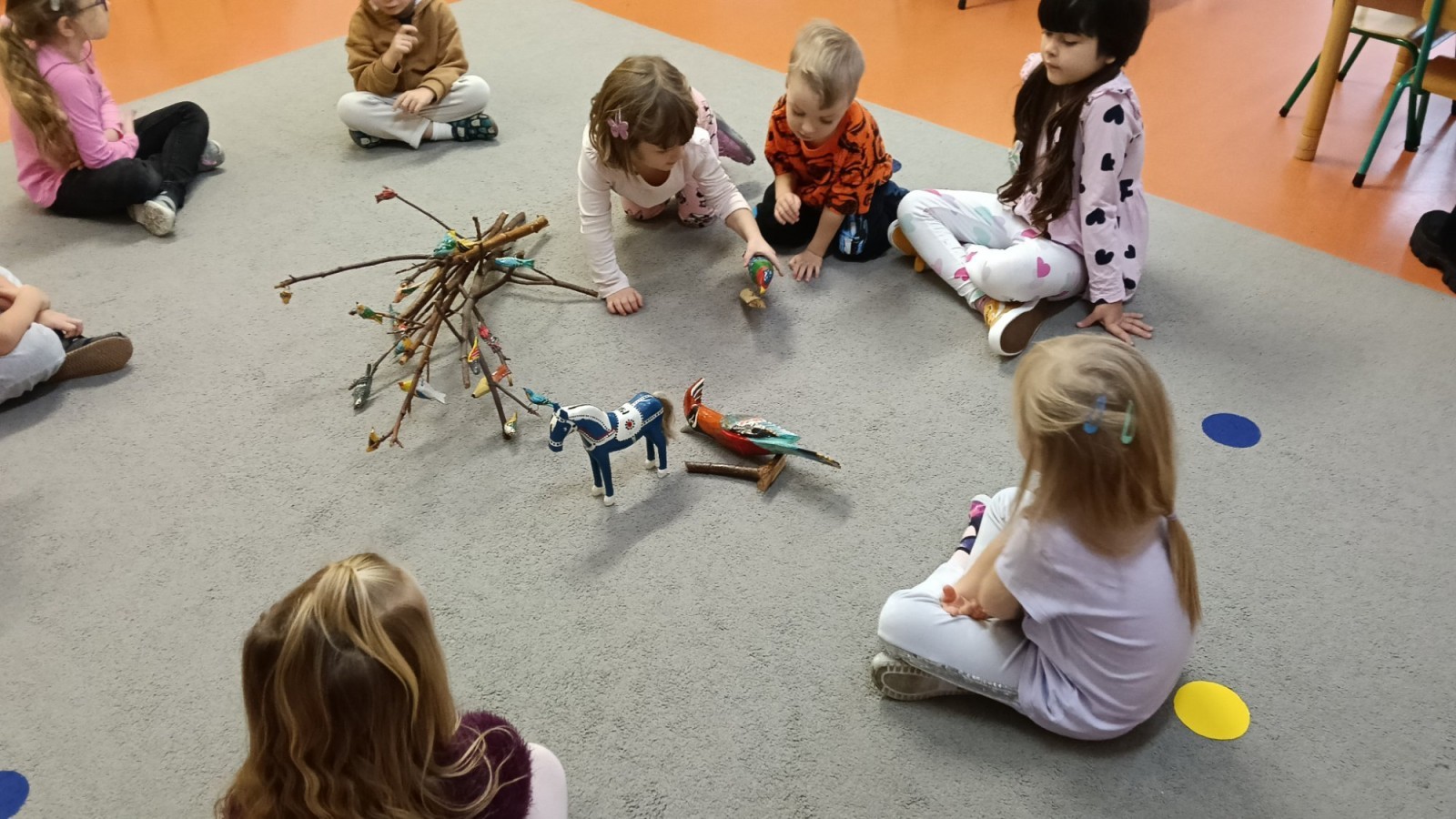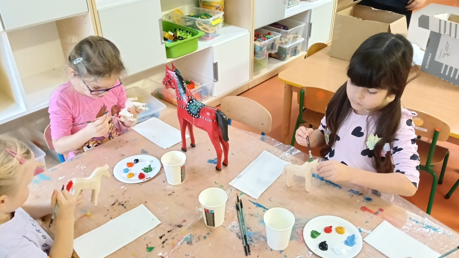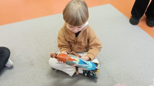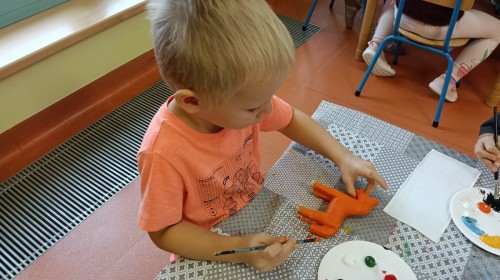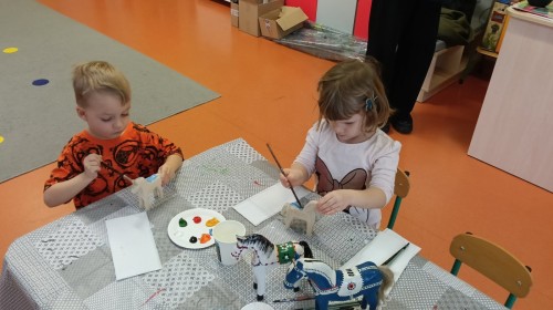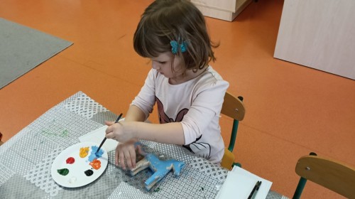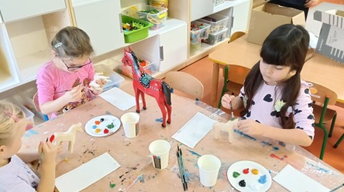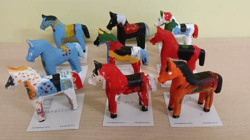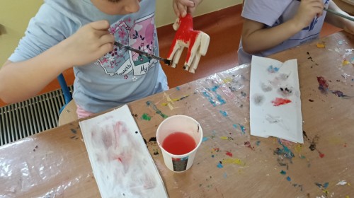 Dzieci oglądały niezwykle urocze drewniane zabawki: ptaszki i koniki. W ramach warsztatów prowadzonych przez Panią Anetę z Regionalnego Ośrodka Kultury w Bielsku-Białej przedszkolaki miały też możliwość wykonania swojego kolorowego konika. Dzieci były zachwycone. Nasze piękne koniki powędrują na wystawę podsumowującą realizację projektu Beskidzka Szkoła Folkloru.