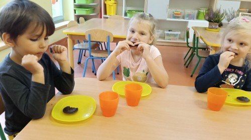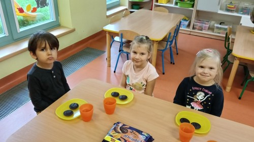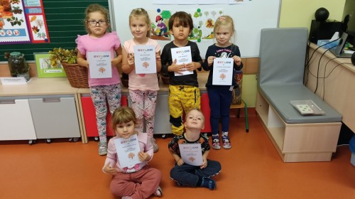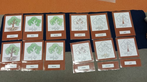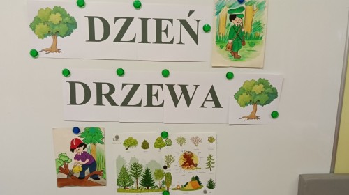 Podczas obchodów Międzynarodowego Dnia Drzewa dzieci wzięły udział w zabawie rytmicznej z reakcją na zmianę natężenia dźwięku „Drzewa na wietrze”. Wykorzystując materiał rozwojowy oparty na metodzie M.Montessori „Duszki” poznały „Budowę drzewa” oraz różnorodność drzew, przyporządkowywały owoce drzew do ich liści, przeliczały liście w zakresie do 6, przyporządkowywały odpowiednią liczbę kropek oraz właściwą cyfrę. Każde w/w działanie zostało sprawdzone tzw. „kontrolą błędu”. Przedszkolaki dowiedziały się o znaczeniu drzew min. oglądając film edukacyjny „Drzewo Basi”. Imprezę zakończyło rozdanie pamiątkowych dyplomów oraz słodki poczęstunek: soczek jabłkowy i ciasteczko z nadzieniem morelowym.