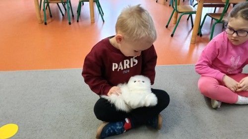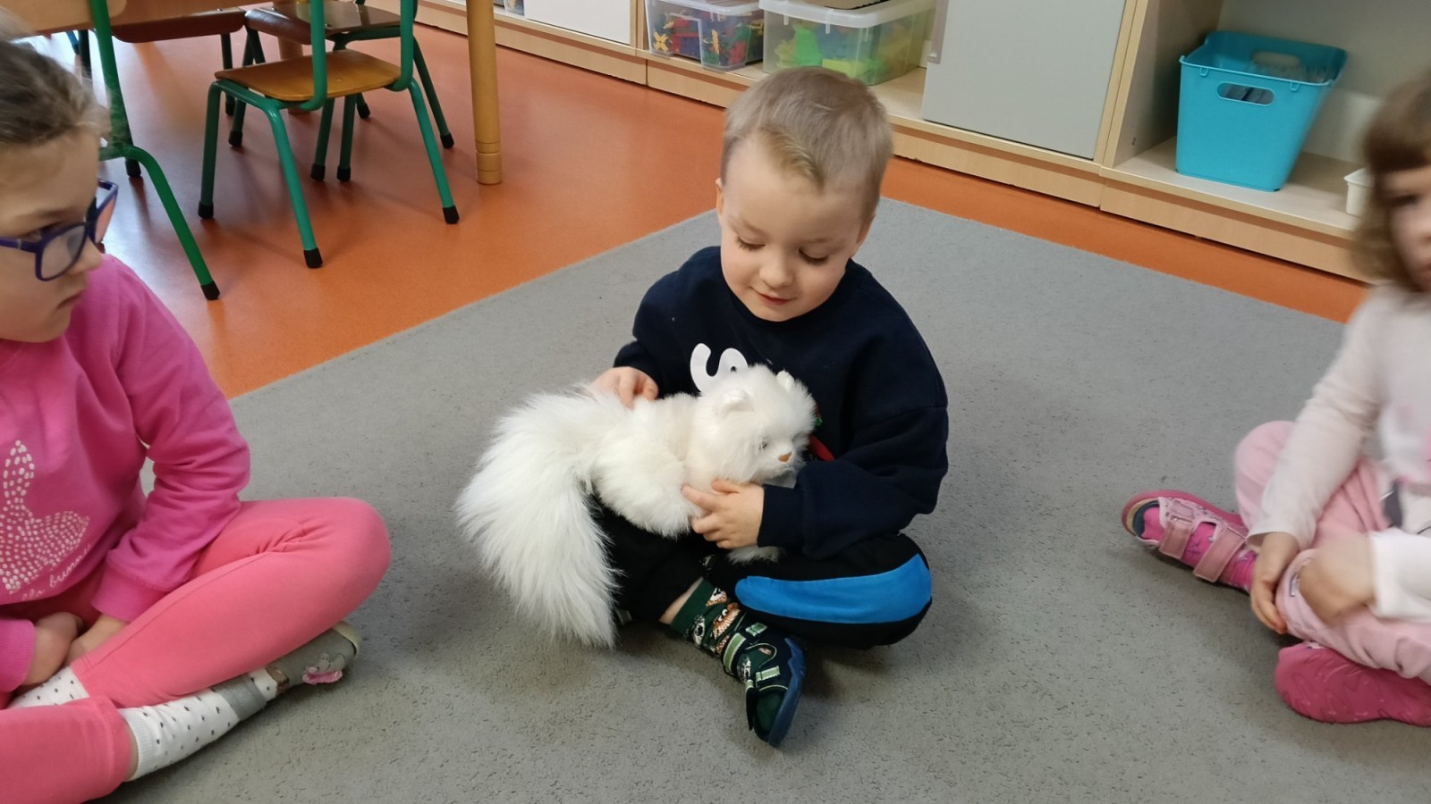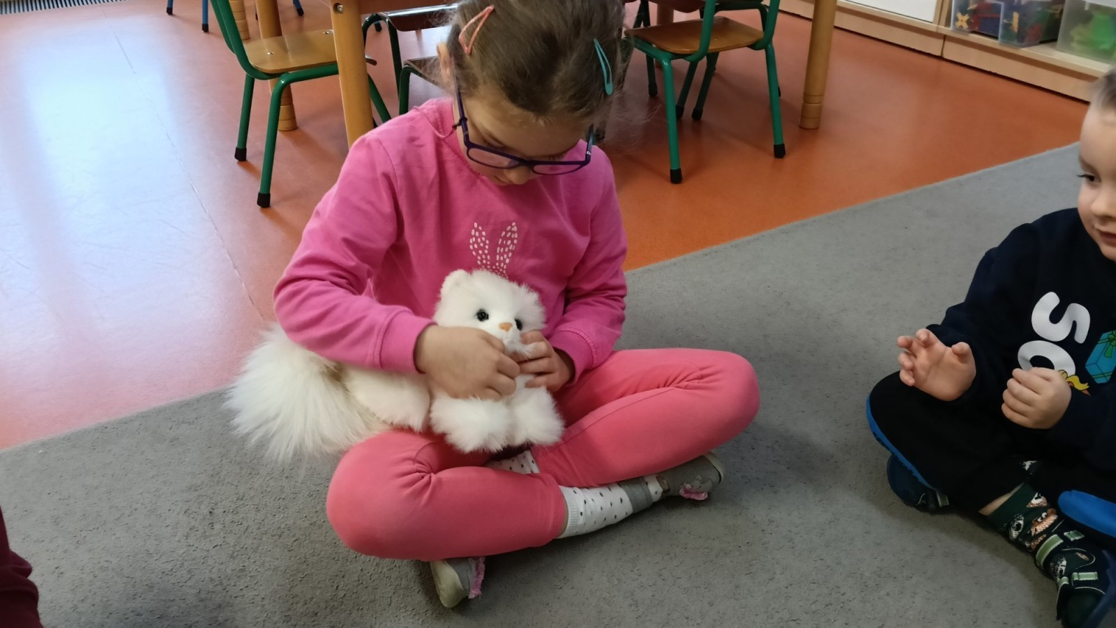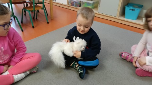 Ponadto przedszkolaki rozwijały umiejętność kontrolowania tonu i głośności mówienia i nauczyły się mówienia szeptem podczas zabawy „Cicho – sza”. Dzieci z ogromną radością wzięły udział w zabawie ruchowej orientacyjno-porządkowej „Koty i myszy”.
