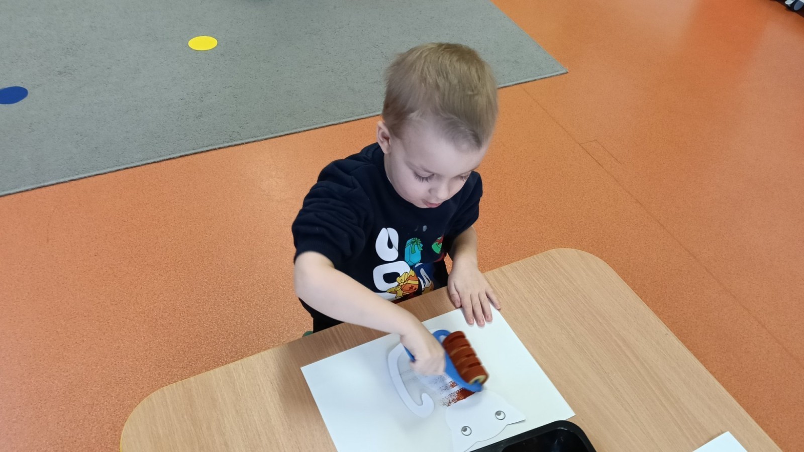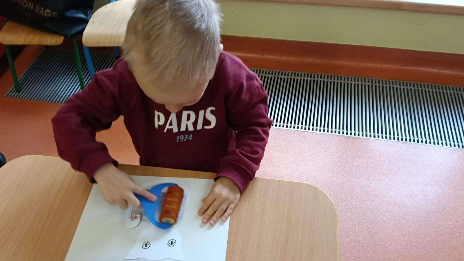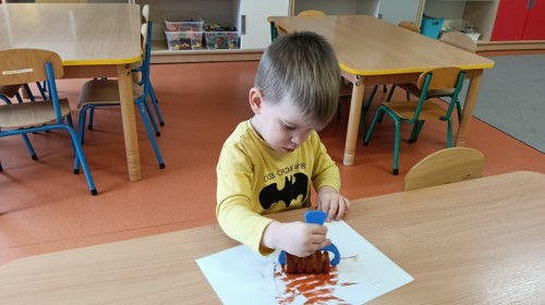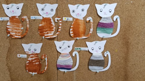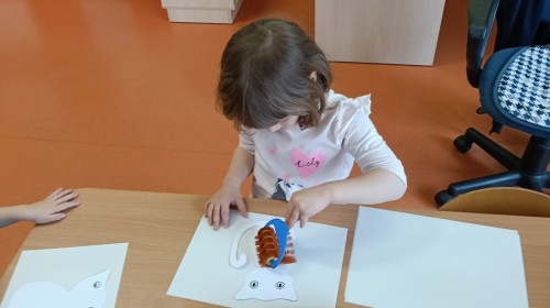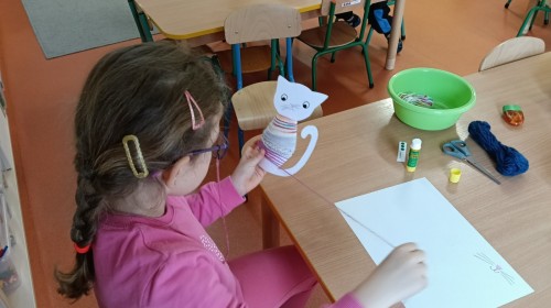 Dzieci wykonały pracę plastyczną: „Kotek” – 3-latki: naklejanie elementów (oczy), malowanie sylwety kota wałeczkiem z gąbki i farbą plakatową; 4-latki: dodatkowo – dorysowywanie nosa i wąsików, 5-latki: sweterek dla kota – owijanie sylwety kolorową włóczką, dorysowywanie nosa i wąsików.
