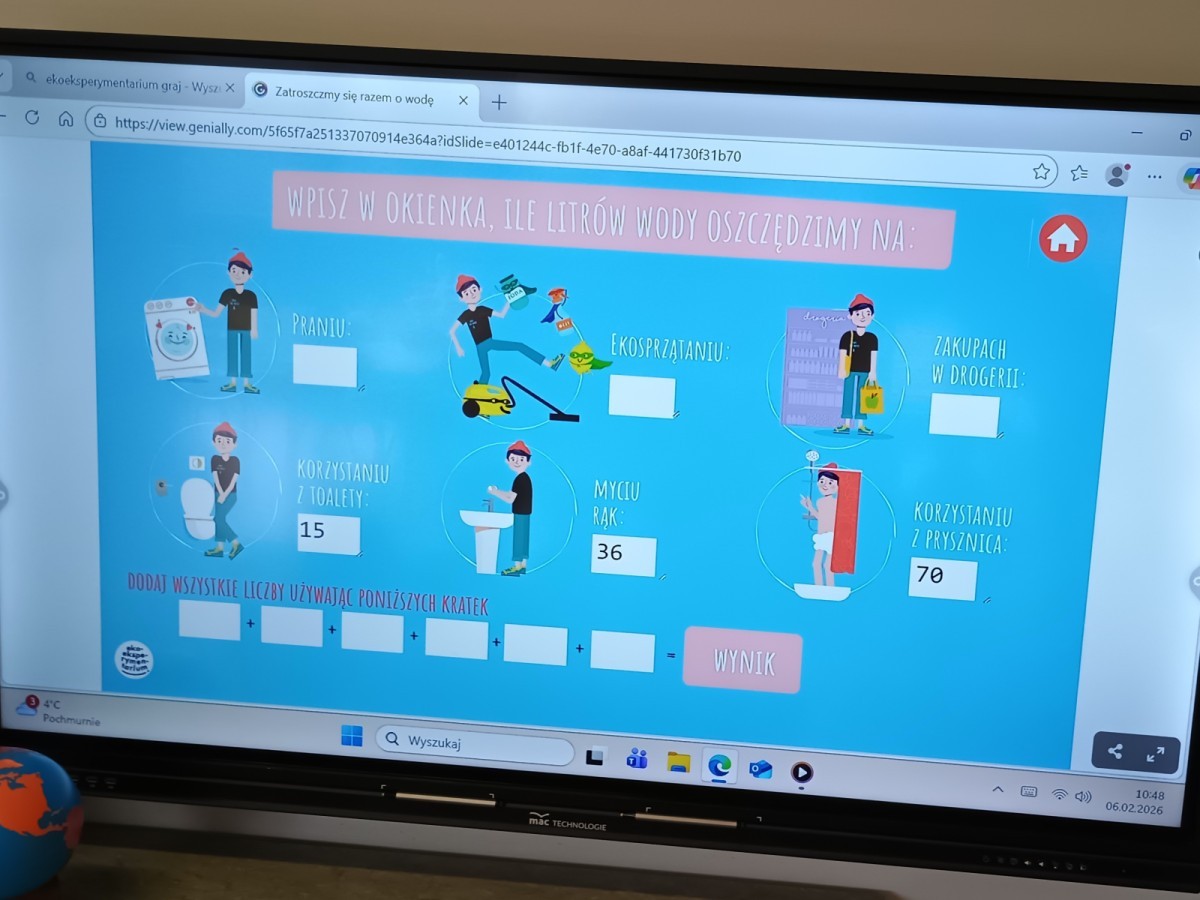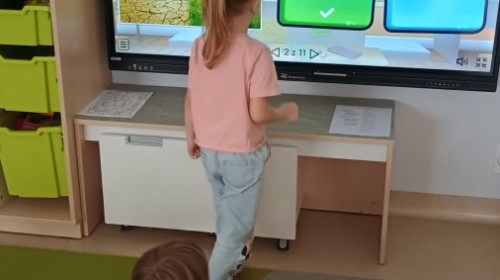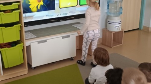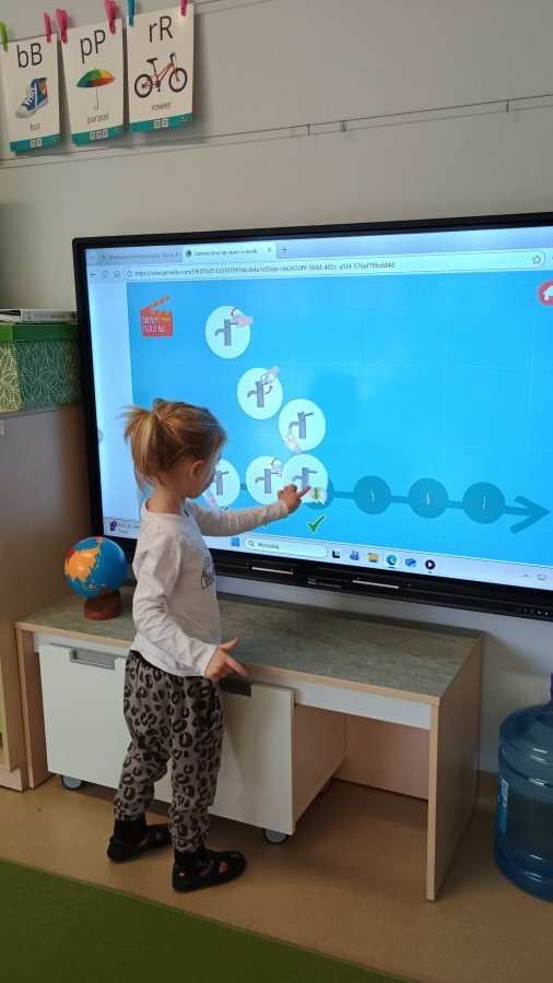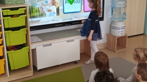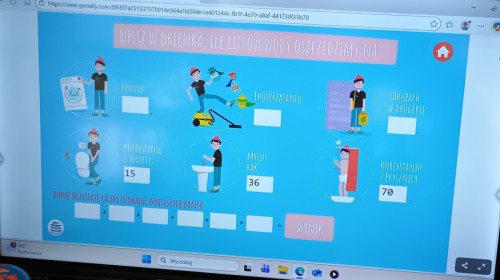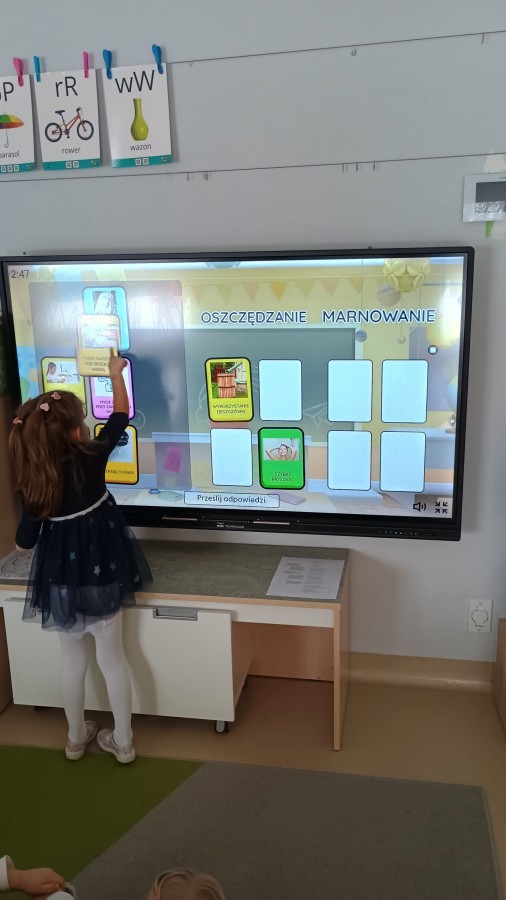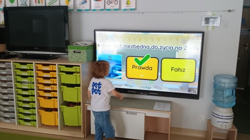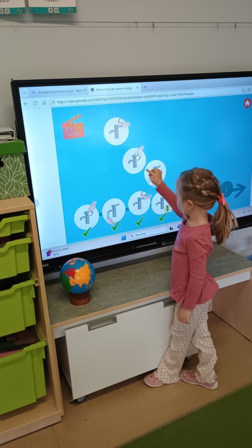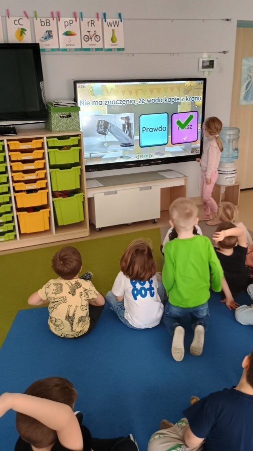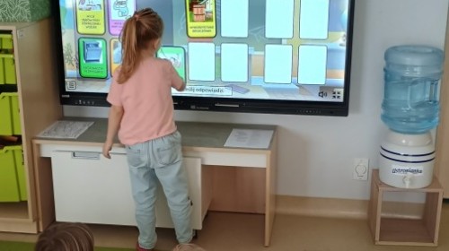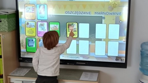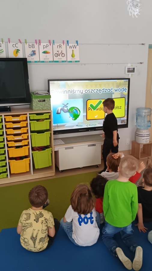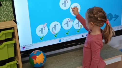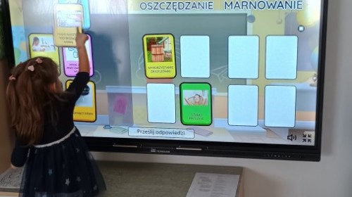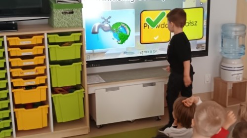 Smerfy wykonały kolejne zadanie ekologiczne - działanie edukacyjne. Wykorzystując tablicę interaktywną przedszkolaki rozwiązywały quizy, zagadki i krzyżówkę, których tematem było poszanowanie wody i ochrona środowiska. Jednym z nich były zadania na platformie EkoEksperymentarium.