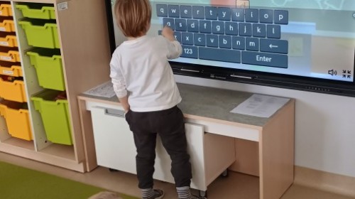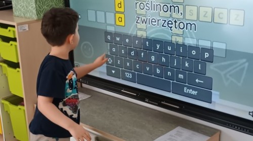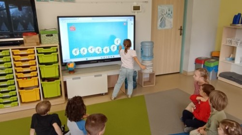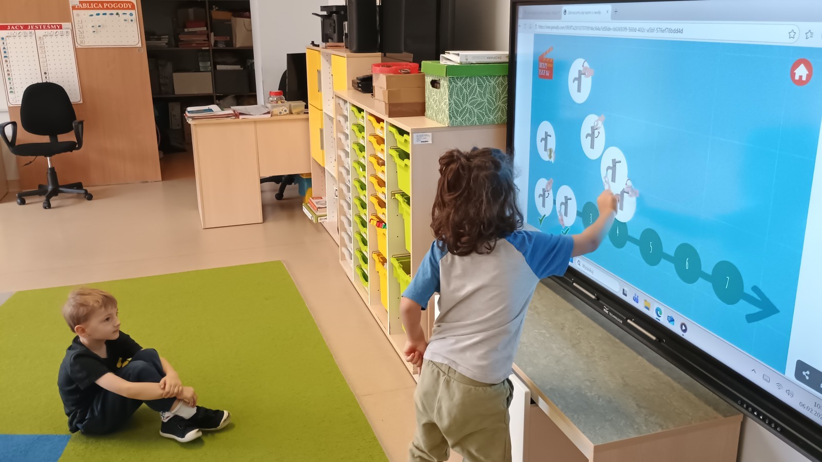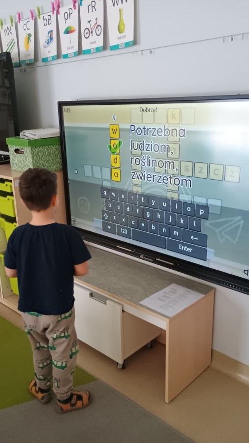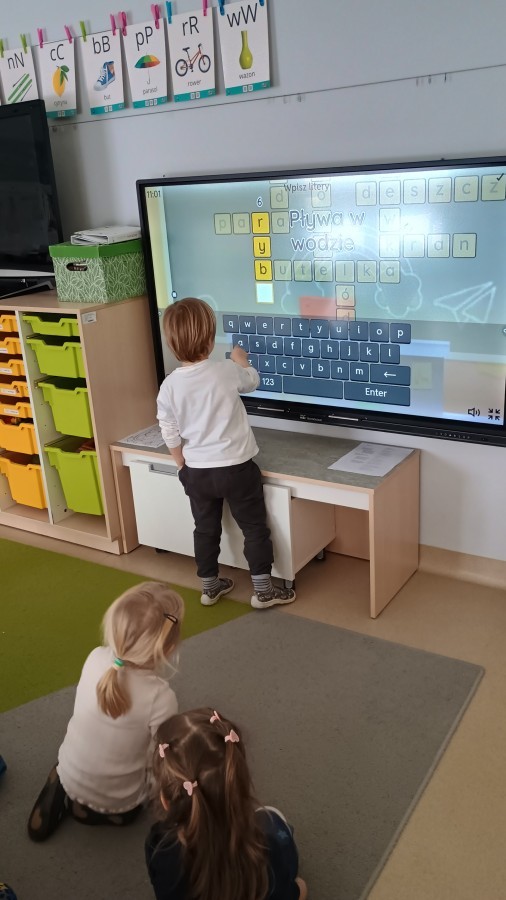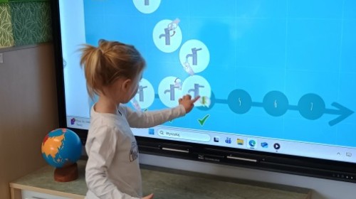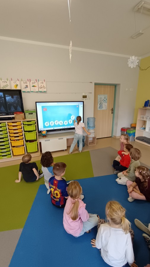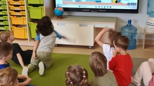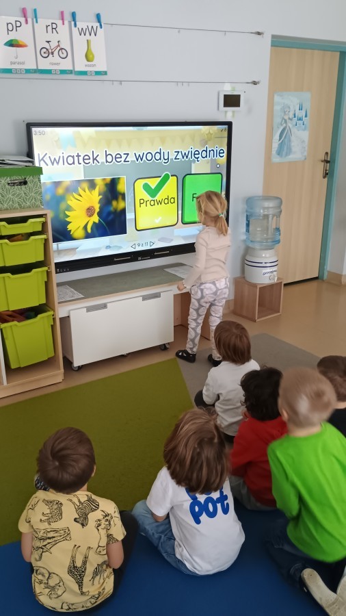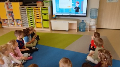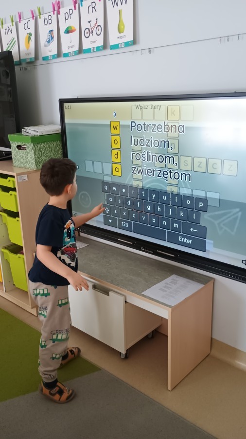 Smerfy wykonały kolejne zadanie ekologiczne - działanie edukacyjne. Wykorzystując tablicę interaktywną przedszkolaki rozwiązywały quizy, zagadki i krzyżówkę, których tematem było poszanowanie wody i ochrona środowiska. Jednym z nich były zadania na platformie EkoEksperymentarium.