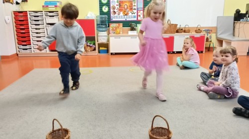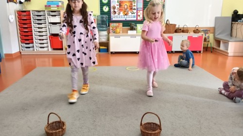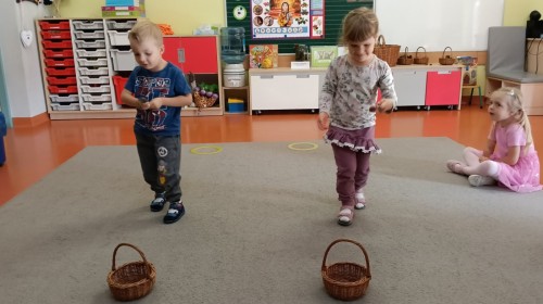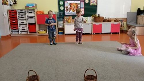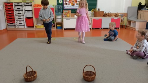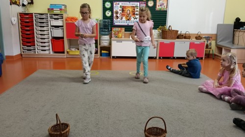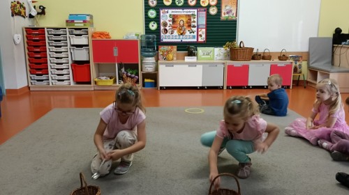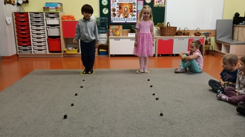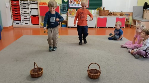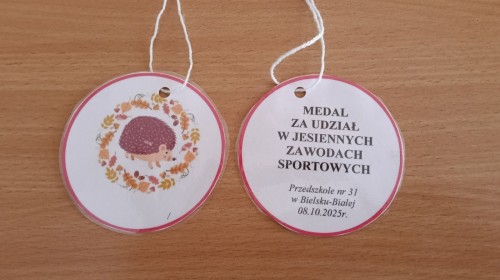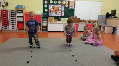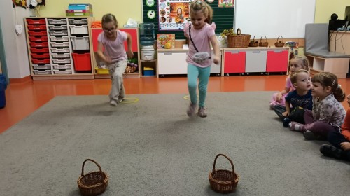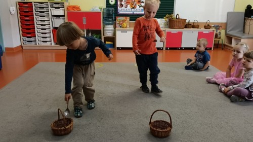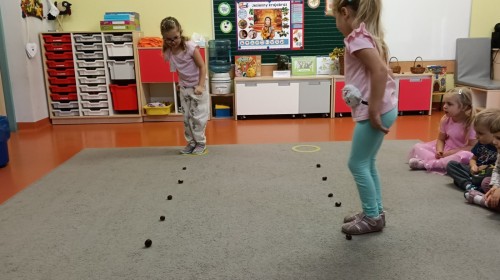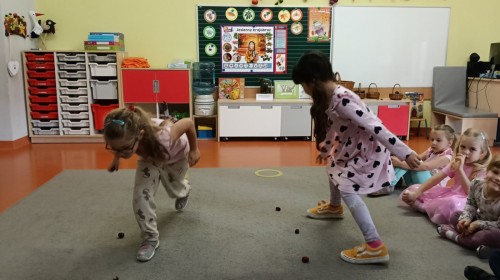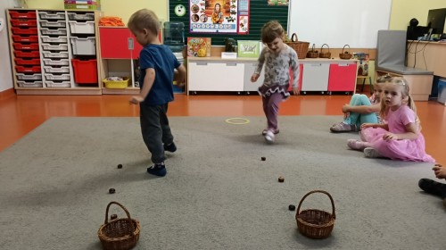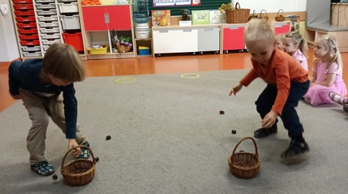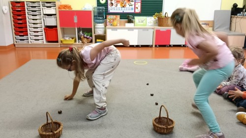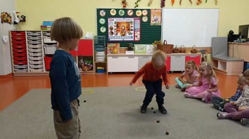 Nasi mali sportowcy z ogromnym zaangażowaniem uczestniczyli z zabawach ruchowych w formie rywalizacji w parach. A że były to jesienne zawody sportowe - to przyborami gimnastycznymi były kasztany i wiklinowe koszyczki. Na koniec rywalizacji wszyscy sportowcy otrzymali pamiątkowe medale.