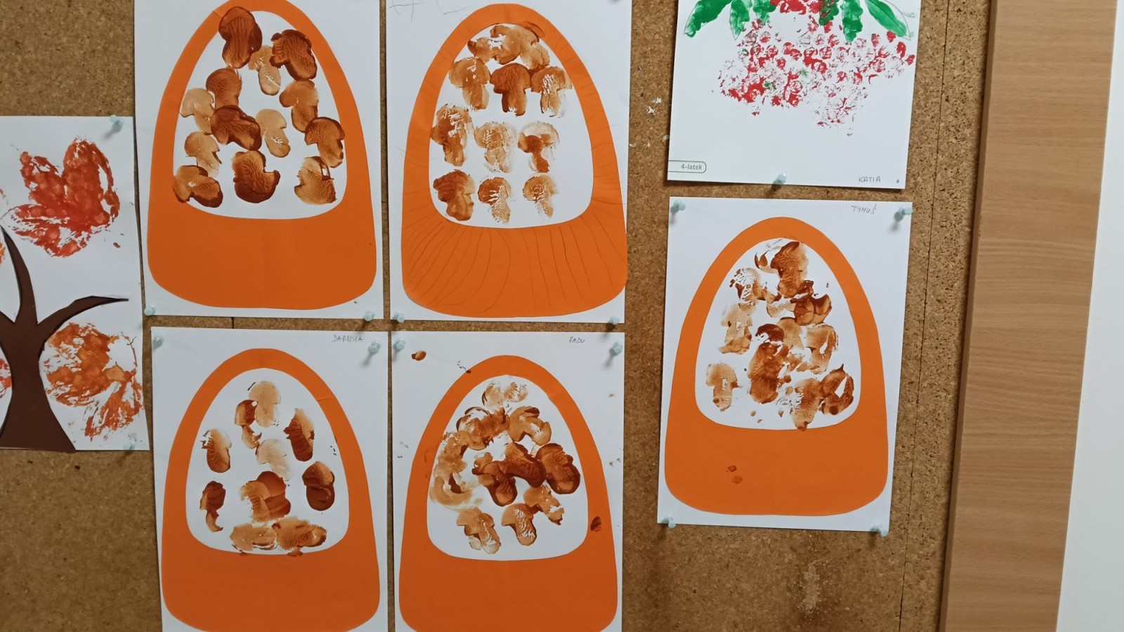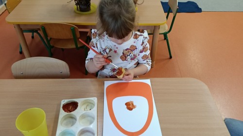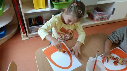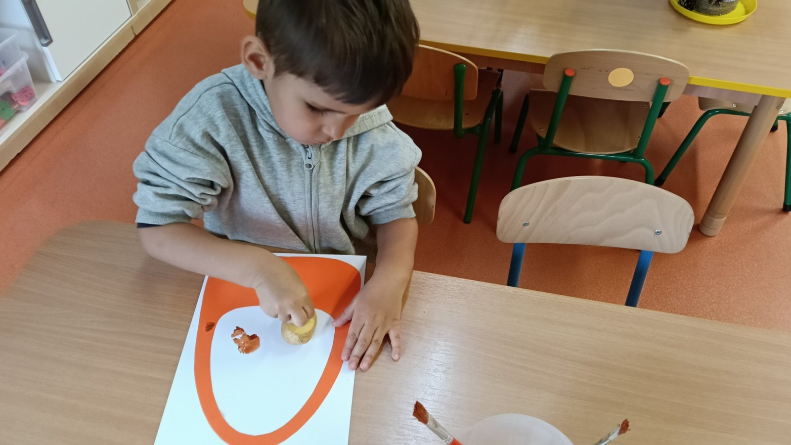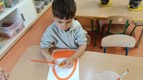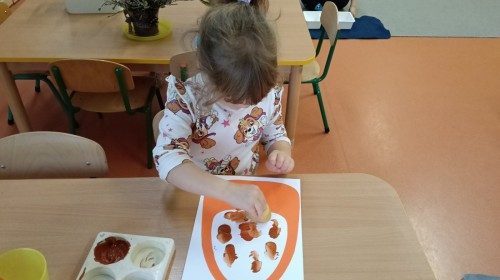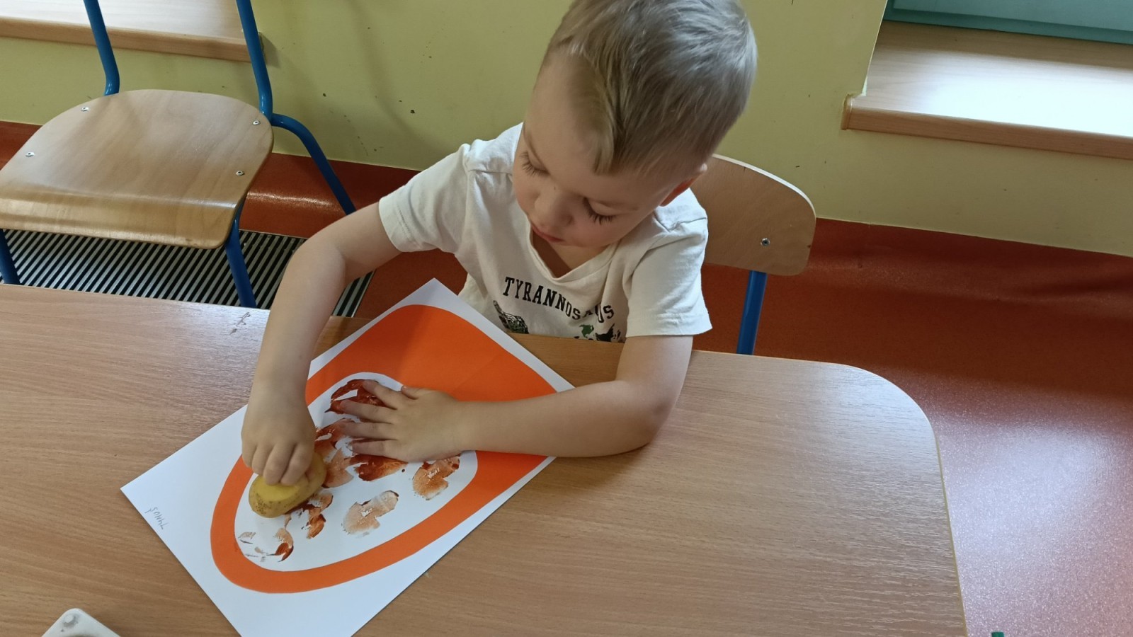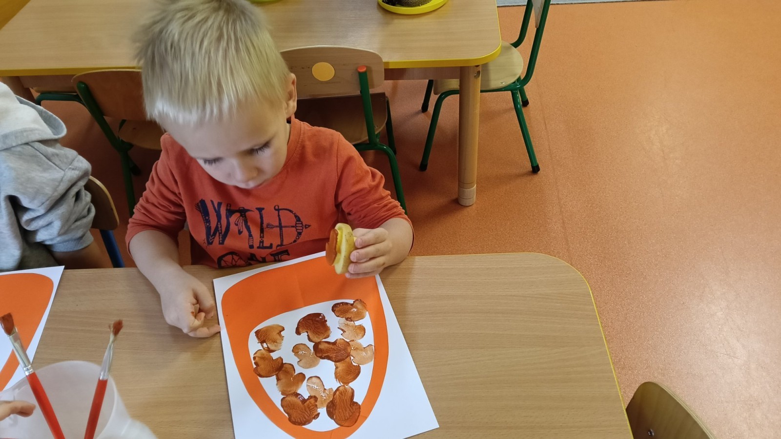 Dzieci poznały nową technikę plastyczną - stemplowanie ziemniakiem i farbą plakatową. 3-latki z zaangażowaniem stemplowały, 4-latki dodatkowo naklejały kosz, a 5-latki ozdabiały kosz prostymi ćwiczeniami graficznymi. I już kosze były pełne pięknych borowików.