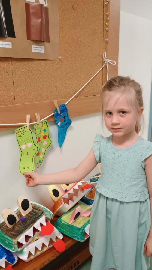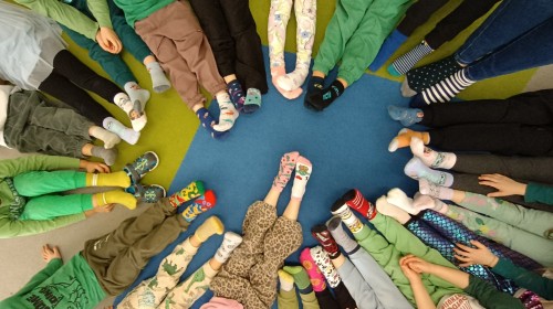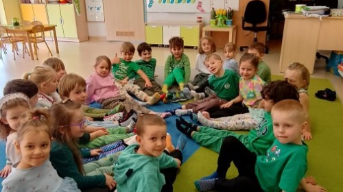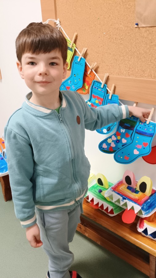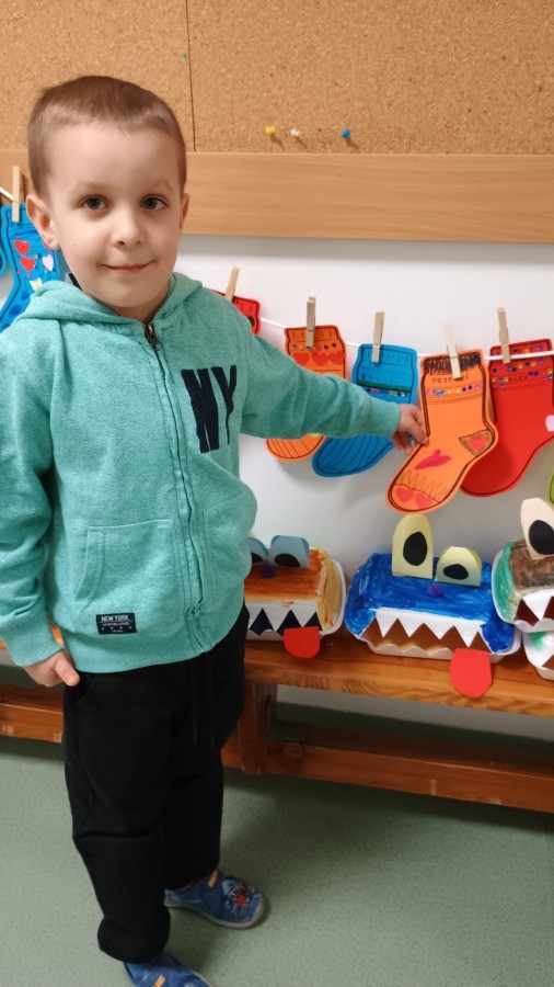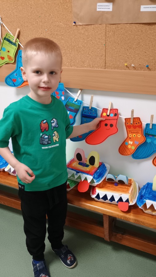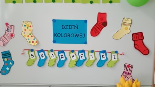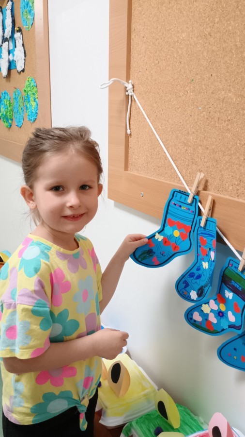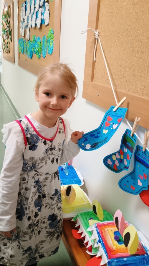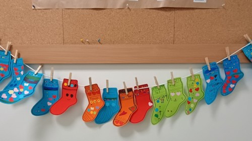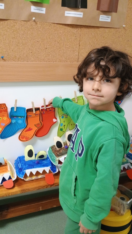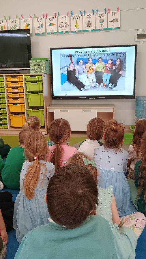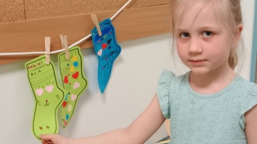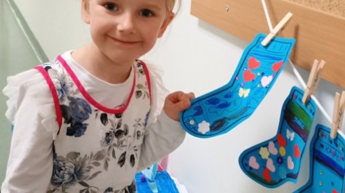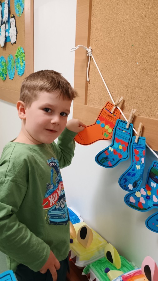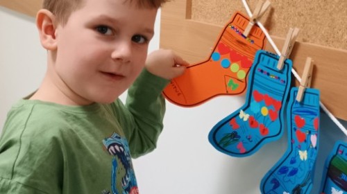 Były zagadki ze zwiastunami wiosny, wiosenne zabawy w sali i w ogrodzie oraz piosenka, a następnie przedszkolaki poznały ideę dnia kolorowej skarpetki, który ma na celu budowanie empatii, tolerancji i solidarności z osobami z Zespołem Downa, naukę akceptacji różnic i zrozumienia niepełnosprawności. Na zakończenie każdy wykonał wyjątkową skarpetkę.