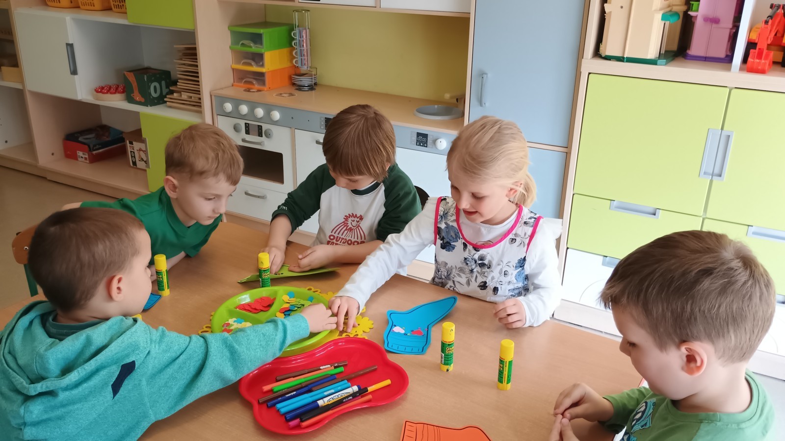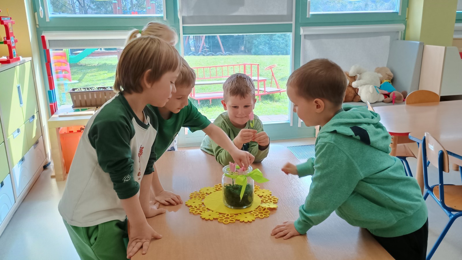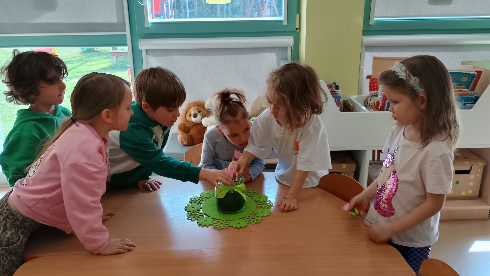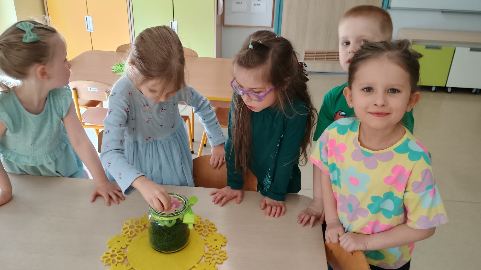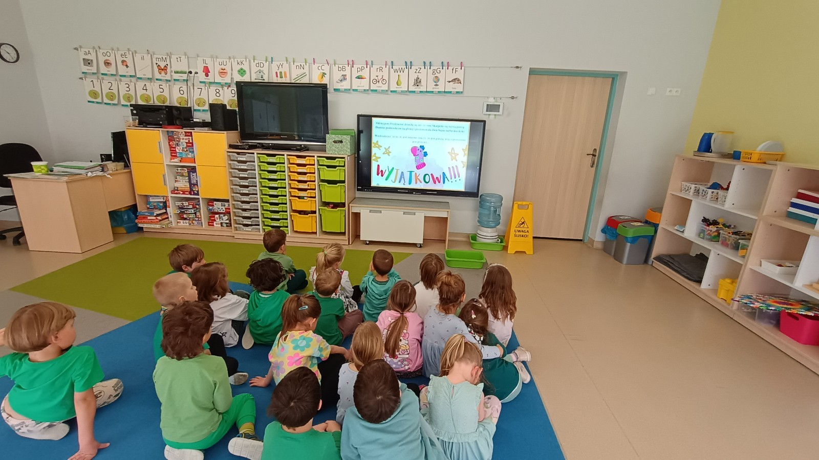 Były zagadki ze zwiastunami wiosny, wiosenne zabawy w sali i w ogrodzie oraz piosenka, a następnie przedszkolaki poznały ideę dnia kolorowej skarpetki, który ma na celu budowanie empatii, tolerancji i solidarności z osobami z Zespołem Downa, naukę akceptacji różnic i zrozumienia niepełnosprawności. Na zakończenie każdy wykonał wyjątkową skarpetkę.