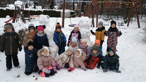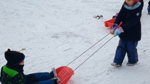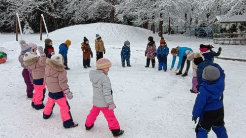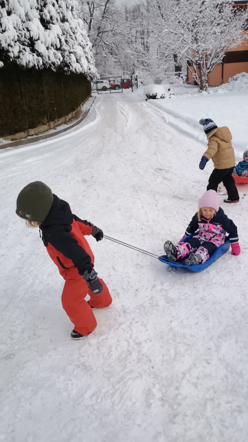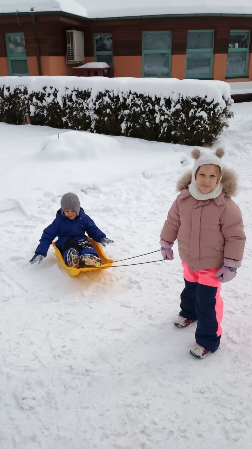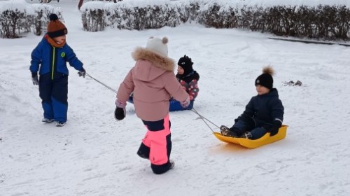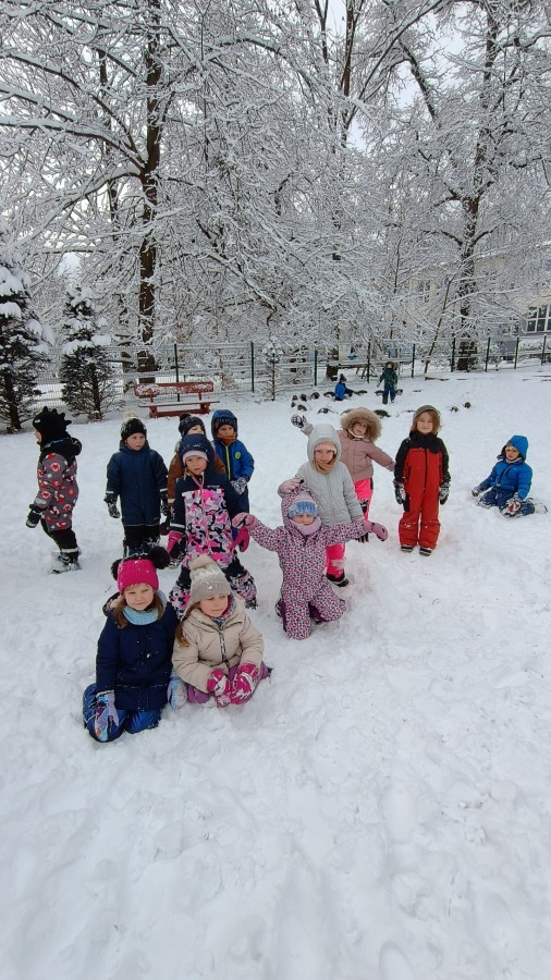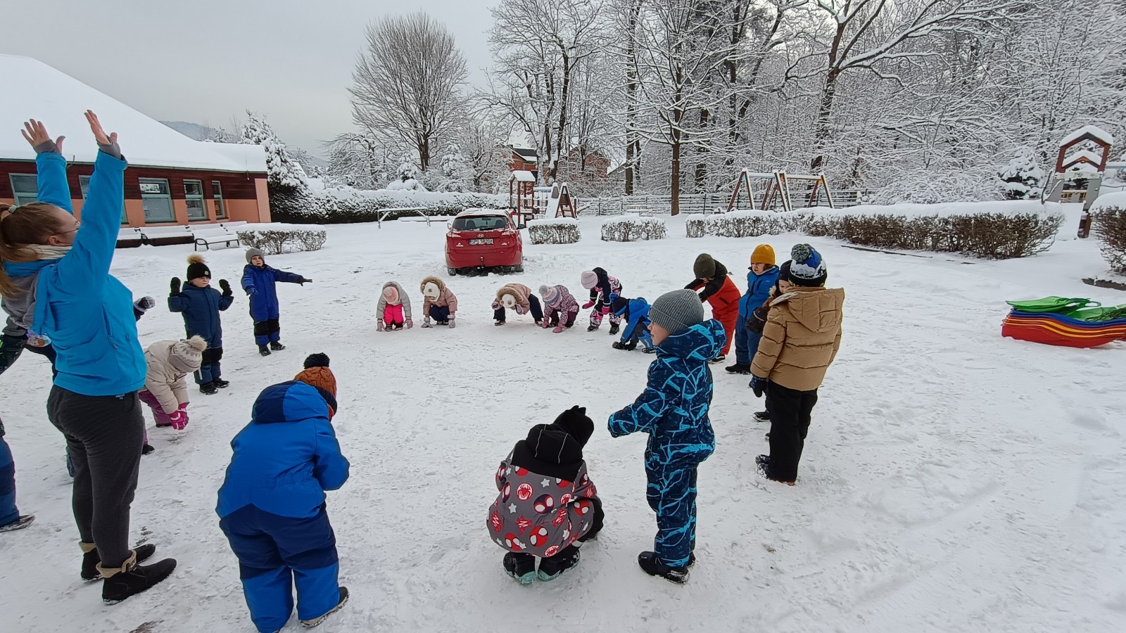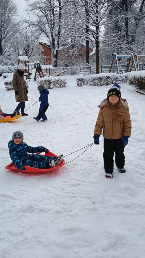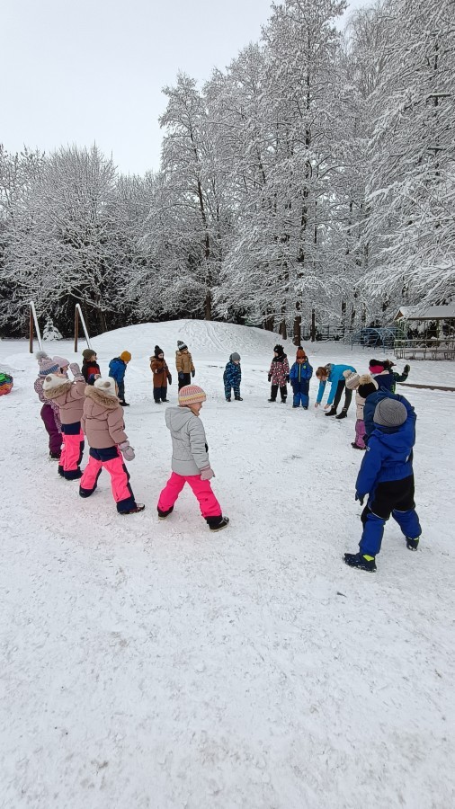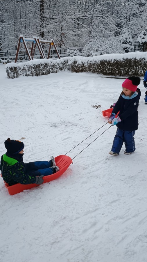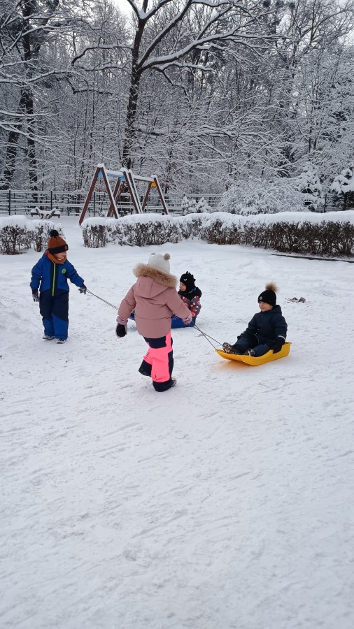 Korzystając z zimowej aury Smerfy wzięły udział w zajęciach z integracji sensorycznej w ramach projektu unijnego na świeżym powietrzu. Była gimnastyczna rozgrzewka, jazda na sankach w parach, zjazdy z górki na ślizgach i sankach oraz śnieżne budowle.