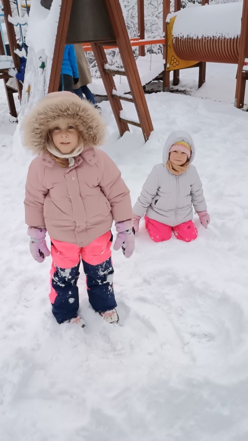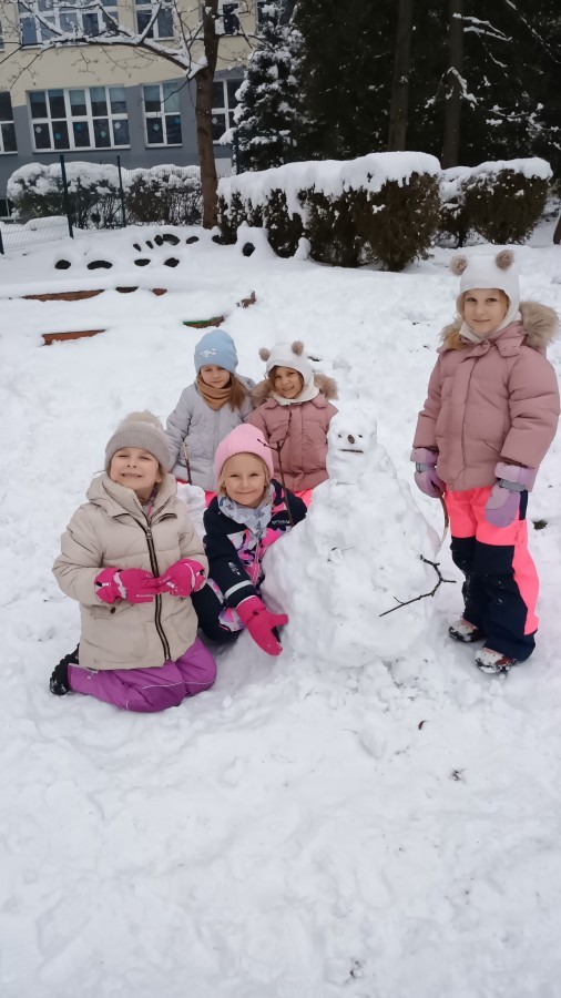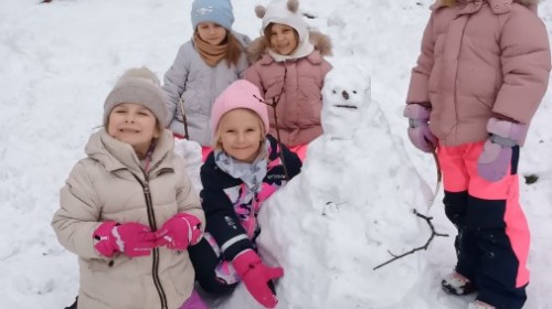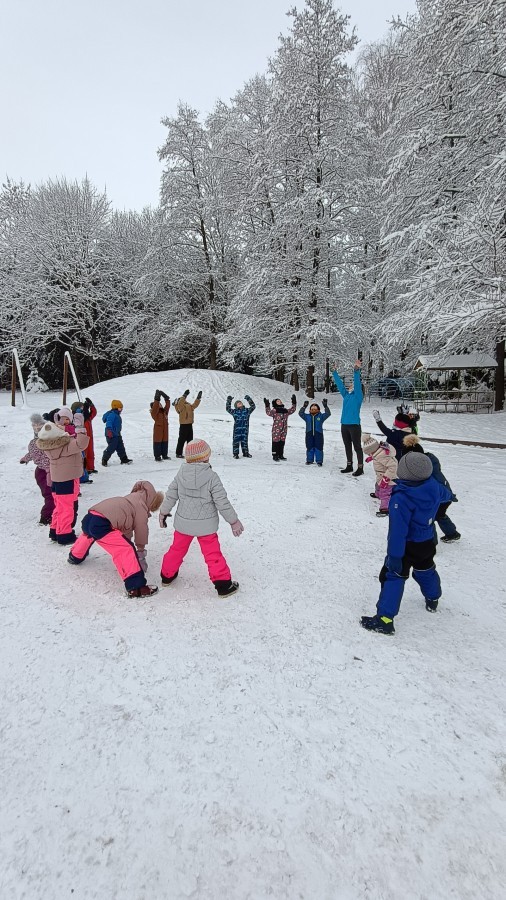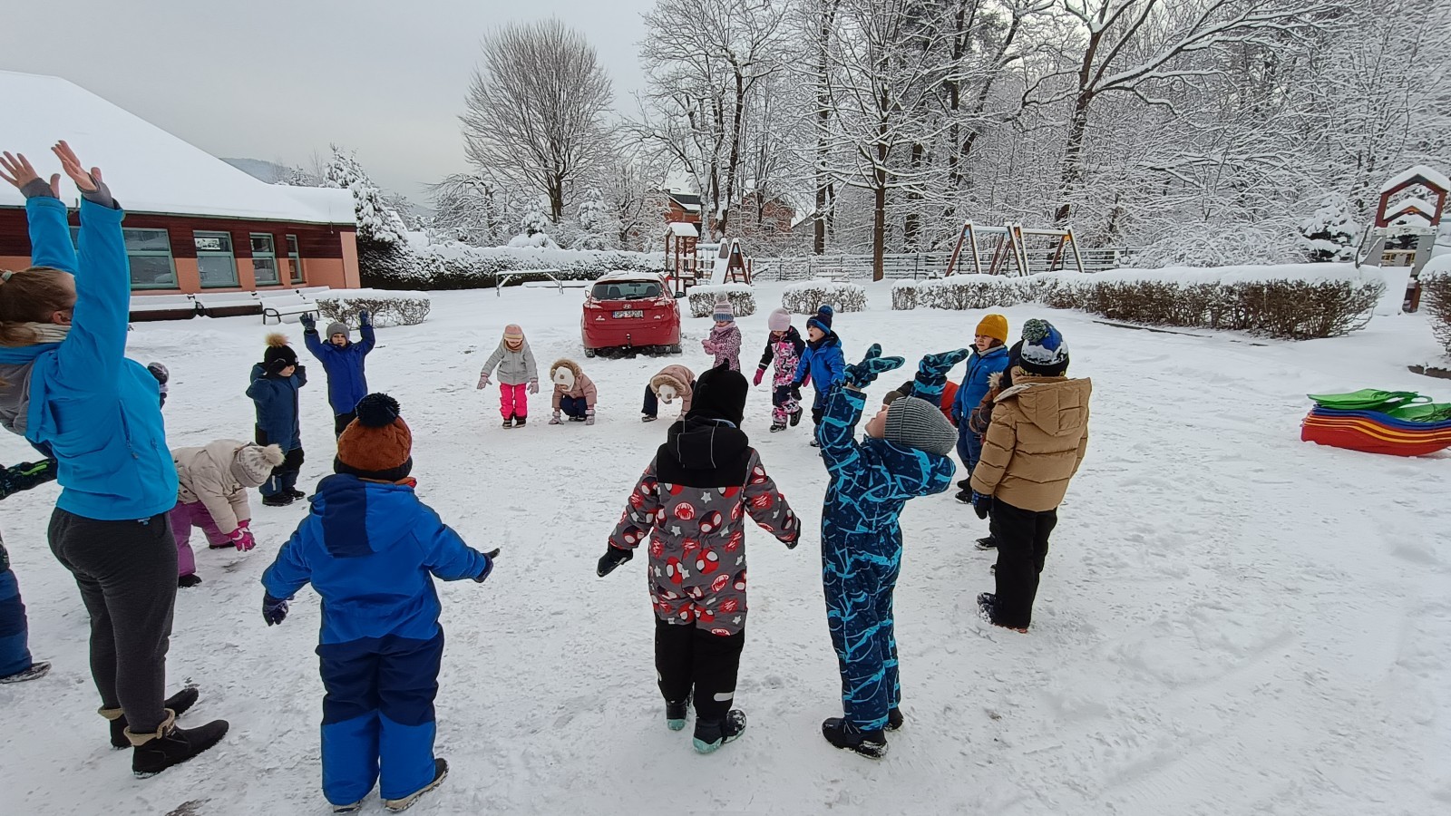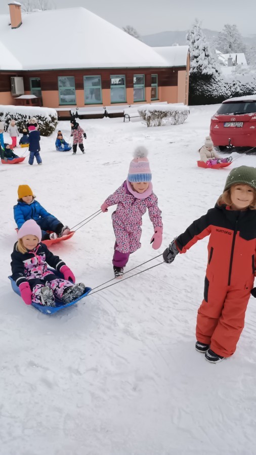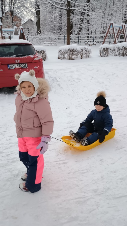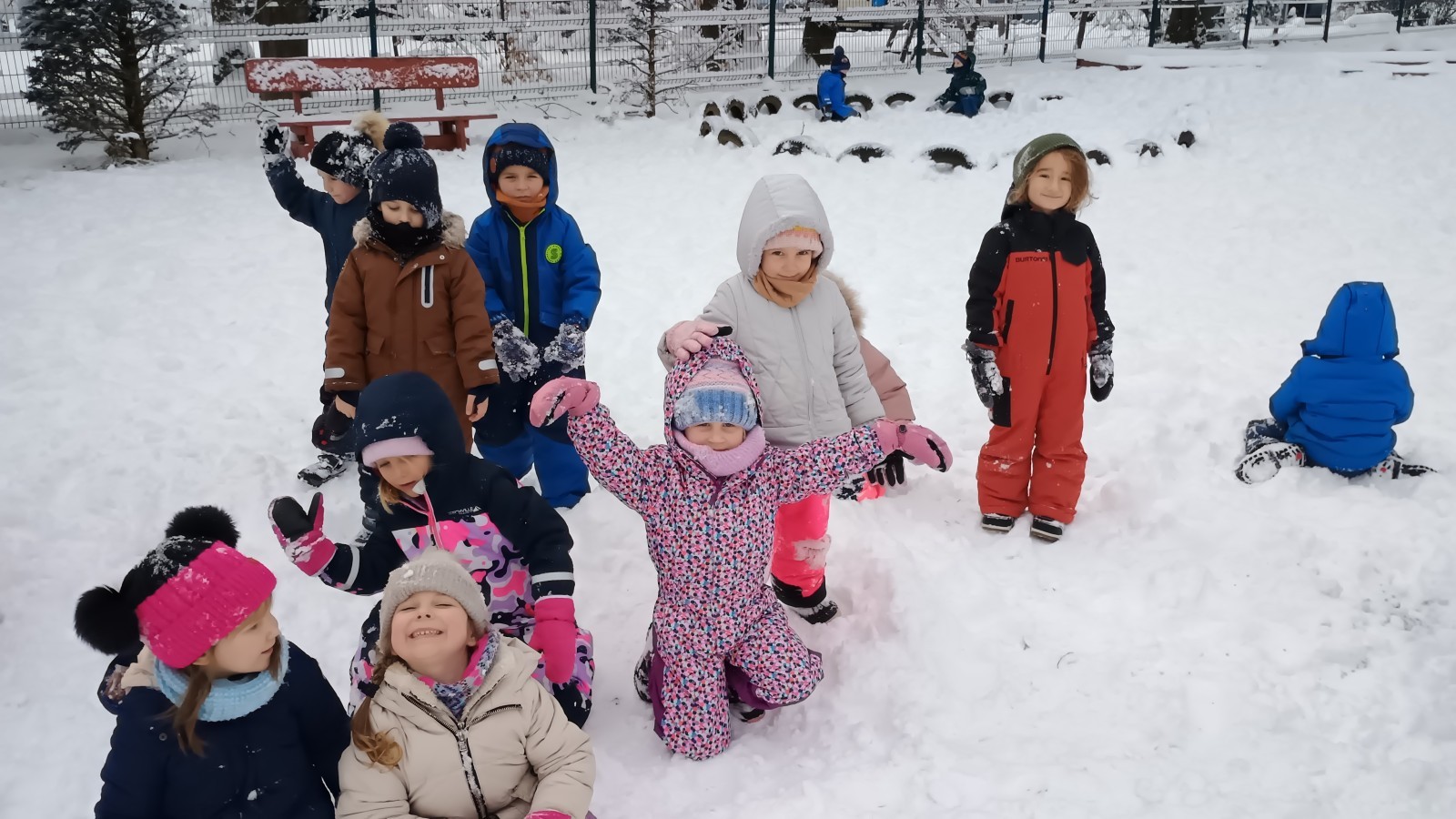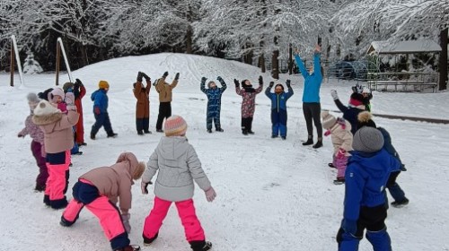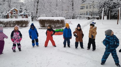 Korzystając z zimowej aury Smerfy wzięły udział w zajęciach z integracji sensorycznej w ramach projektu unijnego na świeżym powietrzu. Była gimnastyczna rozgrzewka, jazda na sankach w parach, zjazdy z górki na ślizgach i sankach oraz śnieżne budowle.