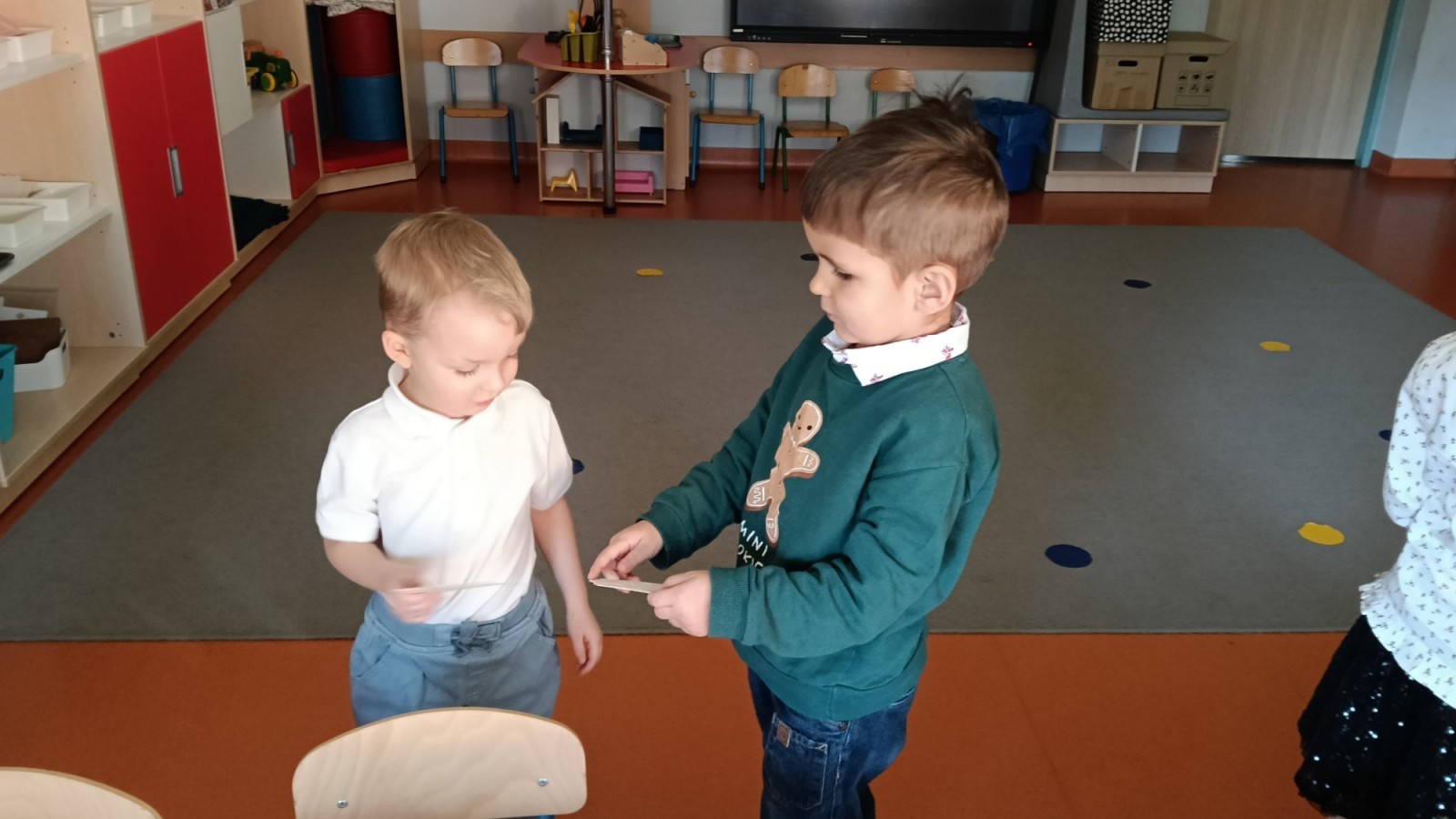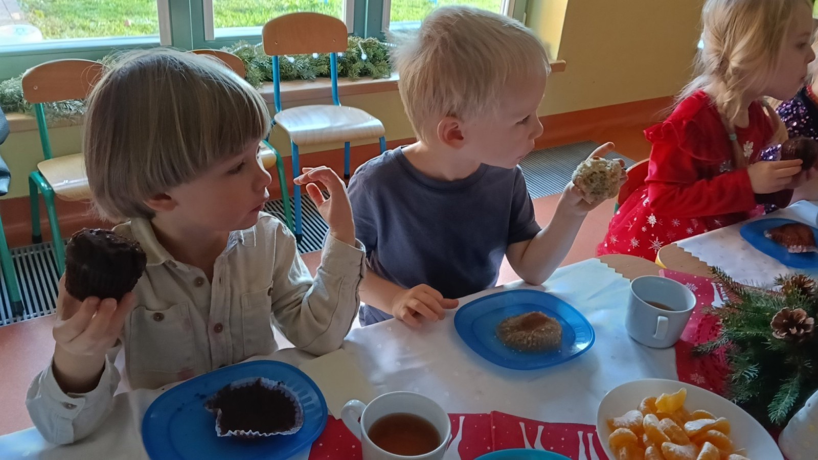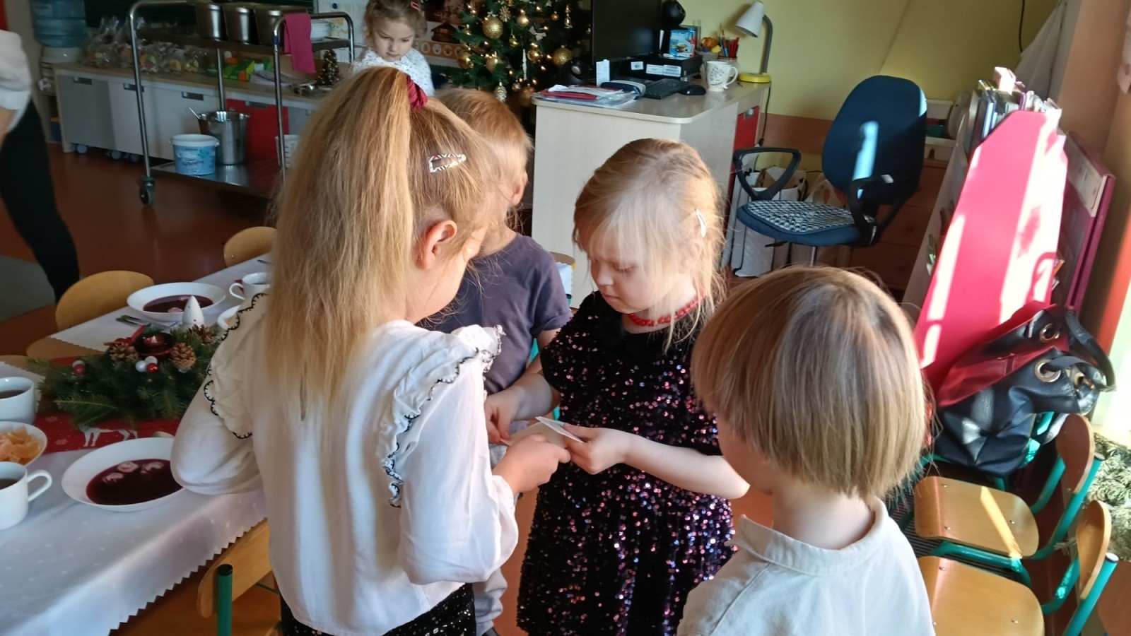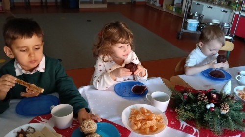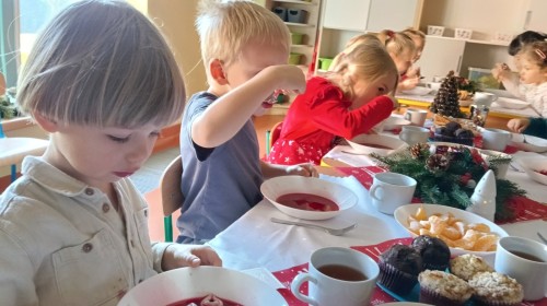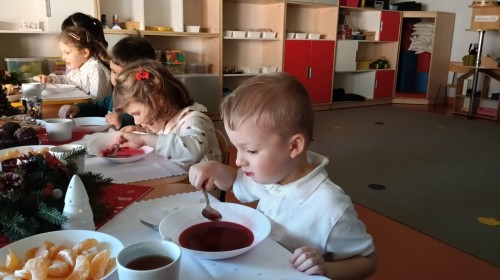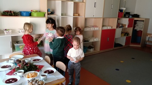To był wyjątkowy dzień. Wszyscy odświętnie ubrani składaliśmy sobie życzenia dzieląc się opłatkiem. Następnie usiedliśmy przy pięknie przystrojonym stole i zjedliśmy przygotowane potrawy, owoce i słodkości. Ten wyjątkowy czas umiliły nam cudowne polskie kolędy i pastorałki. Na zakończenie rozpakowaliśmy prezenty, które znalazły się pod naszą grupową choinką.