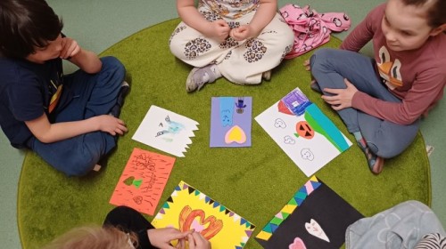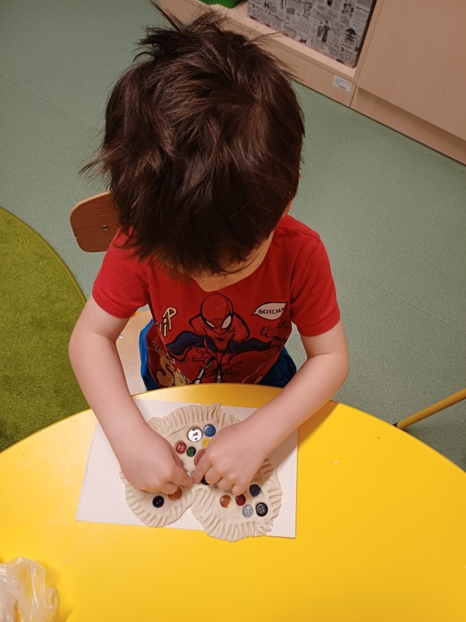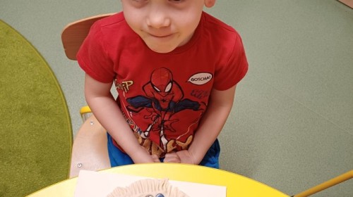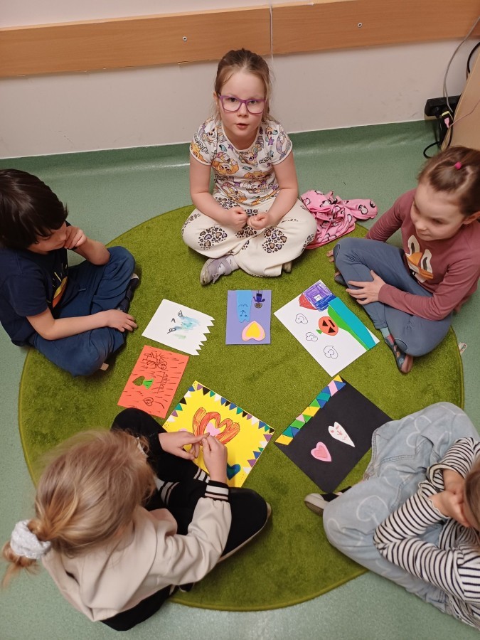 Na prezentowanych zdjęciach dzieci wykonują różnorodne aktywności rozwijające kreatywność, sprawność manualną i współpracę w grupie. W ramach działań rozwijających uzdolnienia powstaje wiosenny collage przedstawiający Panią Wiosnę, który bierze udział w konkursie międzyprzedszkolnym. Praca plastyczna pobudza wyobraźnię, rozwija zdolności artystyczne oraz uczy wspólnego działania.