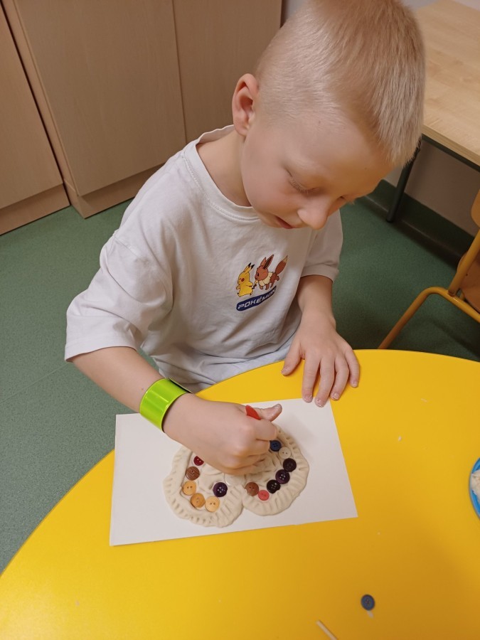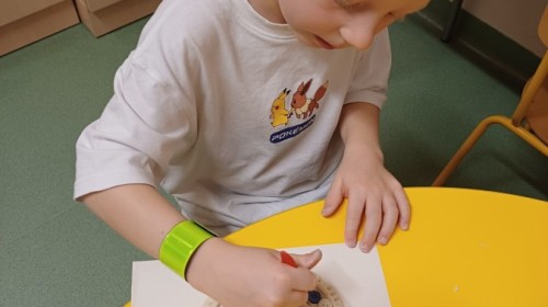 Przedszkolaki przygotowują także prace na konkurs wielkanocny. Z masy solnej powstają zajączki, a wykonywanie tej formy pracy doskonali motorykę małą, koordynację wzrokowo-ruchową oraz dokładność.