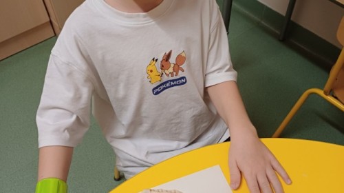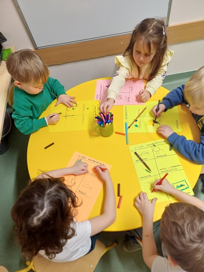 W pracy terapeutycznej ważne miejsce zajmuje działanie w grupie. Na zdjęciach widać dzieci wspólnie tworzą „listę wdzięczności”, ucząc się dostrzegania pozytywnych doświadczeń oraz wzmacniania relacji z rówieśnikami.